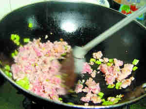 2:燒熱2湯匙油,爆香蒜末、薑末和蔥末,倒入青椒丁和豬絞肉炒散,炒至肉末色變白。