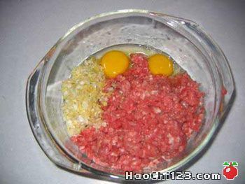 ·操 作: 肉餡中加入鹽、蔥、薑末,雞蛋。用力沿一個方向攪