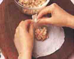 原料: 雞肉、蝦肉各2兩(約80克),冬菇2朵,筍1兩(約40克),馬蹄2粒,姜2片,芹菜(小)1棵。