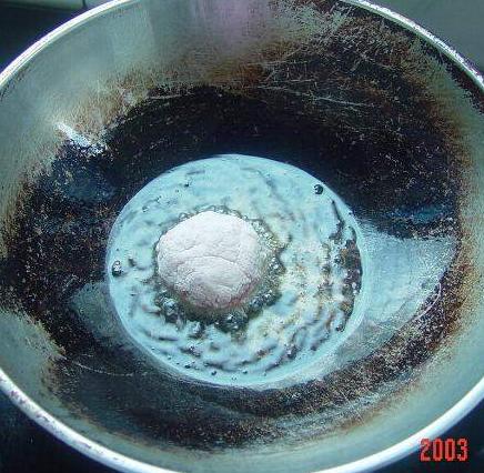 4、將做好的生獅子頭均勻滾上干澱粉,放進油鍋裡面去炸,記得干澱粉一定要滾勻滾薄!