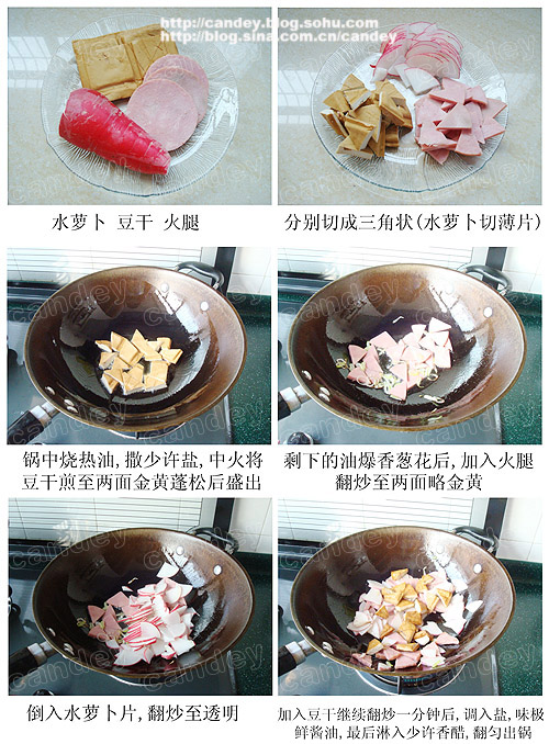 小貼士: 豆乾煎過會更蓬鬆, 較容易入味, 火腿油煸後不光味道好, 而且它的鮮味滲入炒菜的油中, 會給其他配料提味兒.
