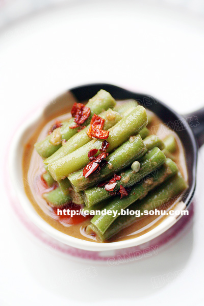 1. 豇豆洗淨,控干水分,切成2-3cm的小段,入沸水鍋中加鹽汆燙5分鐘至熟透,撈出後入涼開水浸涼,撈出備用.