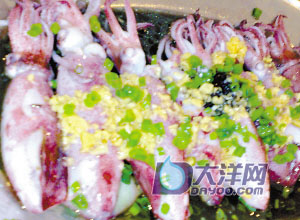 魷魚,與墨魚、章魚同屬軟體腕足類海產品。市場上的魷魚有兩種,一種是軀幹部分較肥大的,俗稱槍烏賊;另一種則較細長,可稱之魷魚仔。魷魚富含蛋白質、鈣、鐵及碘、錳、銅等微量元素,它除了肉質鮮味之外,卵子的味道也同樣甘美。魷魚卵是分批成熟、分批產出的,而不同種類的魷魚,其產卵量的差別也很大,通常從幾百個至幾萬個不等。今天食單選用了俗稱為魷魚王的品種,這種食材最原汁原味的吃法為清蒸,因為這樣能更好地品嚐到其鮮甘爽口的本味。