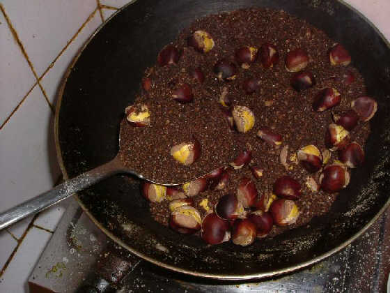 4、栗子在鹽冷的時候下鍋,逐漸加熱,整個過程請不停翻炒,使栗子受熱均勻。局部受熱會使栗子燒焦,並可能引起爆炸。