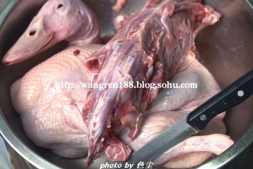 回來把鴨子解凍,下來就該給它脫骨了。咋脫呢?曾經在電視上看到專業廚師給雞脫骨,印象中彷彿是用刀子在雞肚子裡轉呀轉的,就把骨架給拉出來了。但具體做法不記得了。好為難呀~於是上QQ群求救。感謝群裡的朋友肥貓,他給我找來了脫骨鴨的資料,幫了我的大忙。仔細看了看資料,然後開始動手: