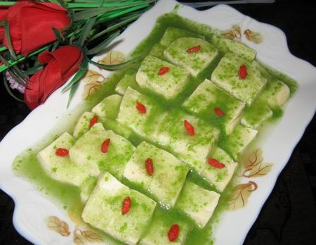 3、將豆腐塊整齊的碼在盤中,澆上調好的汁放入鍋中蒸熟,撒上枸杞子即成。