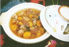 (2)板栗去皮洗淨同豬脊骨、老雞、火腿一起放進沙煲內,加入清湯慢火煲約2小時,挑出豬脊骨,下入精鹽、味精調味即成。