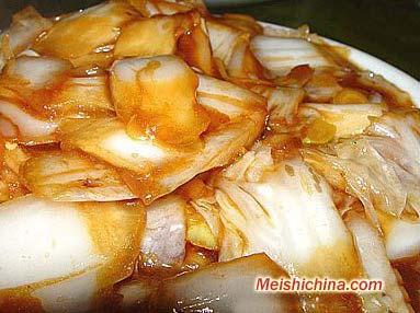 2.勺內加油,燒熱,下蝦米和醬油,精鹽,醋,料酒,白糖,清湯,加入白菜心翻炒,待湯沸時,加水澱粉勾芡,撒入味精,淋上花椒油,即可出勺.