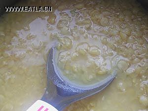3、用電動打蛋器攪拌已經酥軟的豌豆(湯),盡量使豌豆破碎。