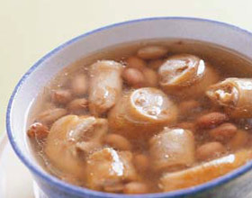 1.先將豬尾焯去汗毛,刮洗乾淨,斬為段。2.將花生肉洗乾淨,一起放入瓦煲裡,注入開水2000克,煲好後得湯1500克。3.煲時用蓋蓋著煲至稔,用精鹽調好味,傾在湯窩裡便成。