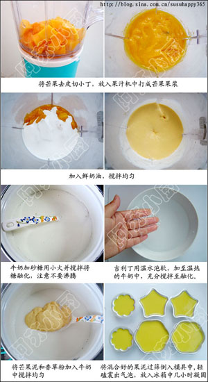原料:芒果果肉500g,牛奶350ml,鮮奶油(淡)150ml,白砂糖50g(如果使用的是植物甜奶油,將糖減到30g),吉利丁片15g(約3片),香草粉1小勺