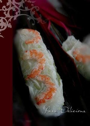 4. 將越式春卷皮平攤在菜板上,用水沾濕,軟後放入粉絲、肉片、黃瓜、香菜,最後於春卷皮2/3處放上剖開了的蝦子。