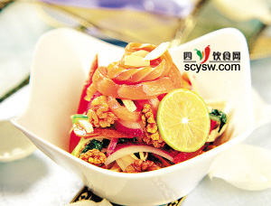 3.將切好的食材與三文魚條拌勻,加入鹽、醬油、檸檬汁、蜂蜜、芝麻油拌勻即可,也可撒些核桃和花生碎。