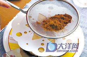 6、凍餅做好之後,不妨用剪紙花樣蓋在餅面上,再適當撒上巧克力粉,作為裝飾。