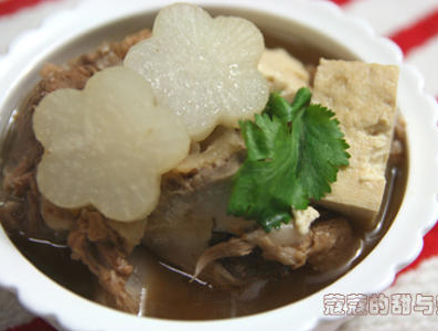 3、蘿蔔去皮切大塊、北豆腐切大塊,放進鍋內再煮半小時,按自己口味加鹽即可。