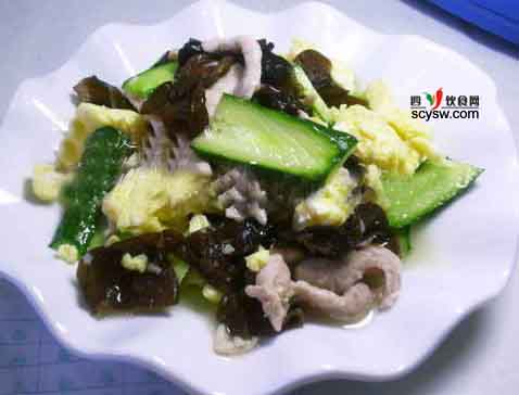 原料:肉絲三兩,雞蛋二個,黑木耳十朵,小黃瓜一根