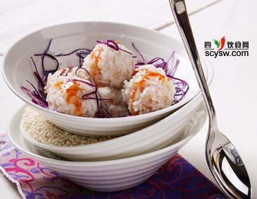4、鍋內留底油,下薑片爆香,加入雞湯,下炸好的肉圓煮熟,放鹽、白糖、老抽王調味,轉大火收汁,用生粉勾芡後,表面滾一層漂亮的糯米飯,裝入擺好青菜的盤中即成。