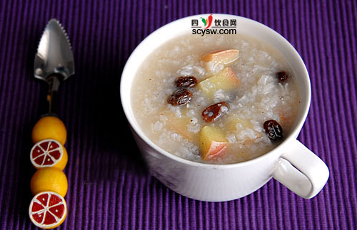 2.鍋中加水10杯煮開,放入白米和蘋果,續煮至滾沸時稍微攪拌,改中小火熬煮40分鐘。