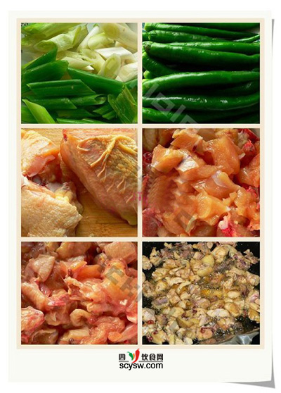 3、炒鍋下油燒至8成熱,下蔥段薑片爆香後下雞塊快速滑至斷生後起鍋, 熱鍋下海椒段煸炒片刻下雞丁、調料翻炒至勻,