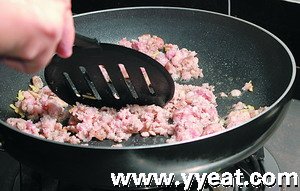 C、先將鐵鍋燒紅用少許油把姜爆香,再將B倒進鍋裡略炒熟,最好把A的材料倒進鍋裡炒一下後馬上關火。用碗把以上炒好的餡料裝好備用;