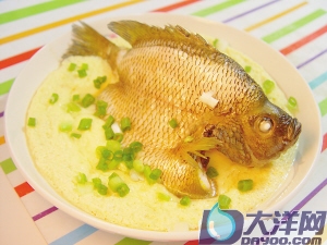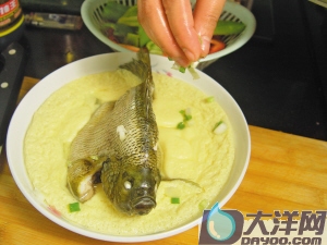 材料:太陽魚(1尾,234克)、雞蛋(2只)、姜絲(半湯匙)、蔥花(半湯匙)