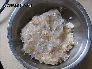 2.材料剁好後加半個蛋清、少許胡椒粉、生抽兩大匙、鹽小半匙、生粉麻油拌勻(記得往同一方向攪拌起膠)