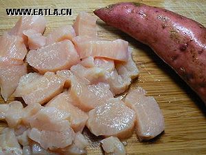 1)準備材料:小個兒的紅薯一個,生的雞胸肉一片,切成小塊兒。