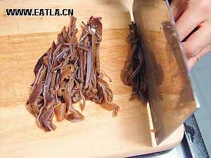 2 金針菇去根部,洗淨後切半;鮮黑木耳去蒂,洗淨切成細絲。
