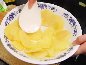 週末放假,建議大家試做田園土豆餅為下午茶,土豆餅的成功秘訣:一是土豆有圓長之分,圓土豆為白肉,水份較少,粉質較重,蒸熟後加少許麵粉便可做成麵團;而長土豆為黃肉,水份很多,質地脆嫩,蒸熟後呈糊狀,要加入較多麵粉才能做成麵團。二是煎制土豆餅時,要用中小火慢煎至金黃色,用大火煎則易煎糊。