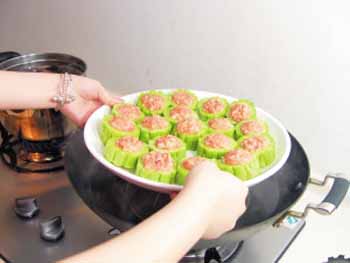 4 燒開半鍋水,放入釀好的苦瓜,加蓋隔水大火清蒸15分鐘,取出倒出盤中的湯汁,放在旁邊攤涼。