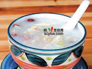 2、粳米洗淨,與湯同煮成粥,兌入沙糖調勻。