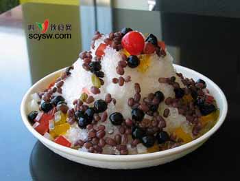 4)將冰沙盛入碗中,把適量熬好的綠豆鋪在冰沙上,再加入煉乳即可。