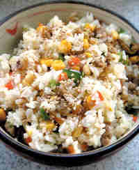 3)加入青椒、胡蘿蔔翻炒後,加入米飯。最後放玉米,再加鹽調味。
