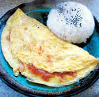 4)煎鍋攤入雞蛋,在蛋的一半位置上加入做好的醬,再用大煎鏟,把另一半蛋蓋好就可以了。