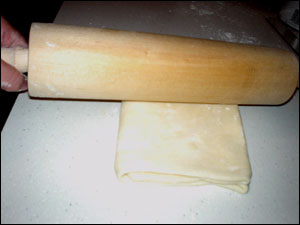 9、從捏死的這一端用手掌由上至下按壓面片。按壓到下面的一頭時,將這一頭也捏死。將面片擀長,像疊被子那樣四折,用壓面棍輕輕敲打面片表面,再擀長。這是第一次四折。