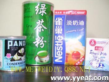 材料:淡忌廉(奶油)500ML、煉奶 400ML、鮮奶 100ML、綠茶粉 1大湯匙。