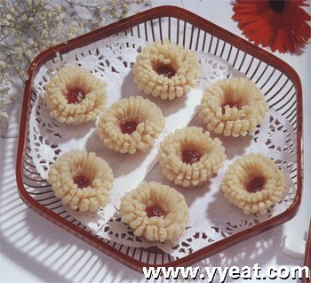 原料:精麵粉250克 熟豬油1000克 綿白糖20克 食用色素 雞蛋清各少許
