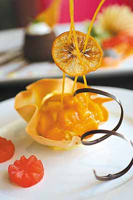 用鮮芒果茸和忌廉芝士拌勻,下層的托盤則是用威化餅現場定型製作,保證入口鬆脆。再加上烤檸檬做裝飾,上好的材料加上大廚的巧妙「雕刻」一件藝術甜品就這樣誕生。