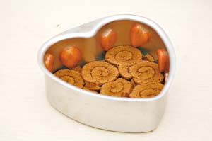 1.把蛋糕卷切成1.25cm的厚度,擺放在模具底,把草莓切片排在模壁上;