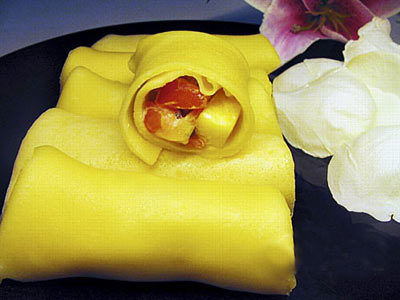這道水果色拉卷口味甜美,黃色的水果色拉卷、黑色的餐盤配上白玫瑰花瓣和香水百合,既養眼又養神,充滿小資情調。當然製作起來就不像一般家常菜那麼隨意了,週末有閒情的時候可以試試。