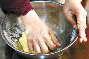 派皮材料:奶油 80g、鹽 1/2小匙、糖粉 30g、水 20g、低筋麵粉 130g(6寸派份量)
