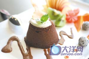 這道熱吃的甜品,不但有巧克力布甸,還有很多可口的水果伴碟,布甸用著名的比利時巧克力品牌“貝可拉”,可見完美。外面烤得香甜的布甸,切開裡面軟滑的雲尼拿汁和巧克力醬就會順著流出來,讓人吃完忍不住還想再來一口。