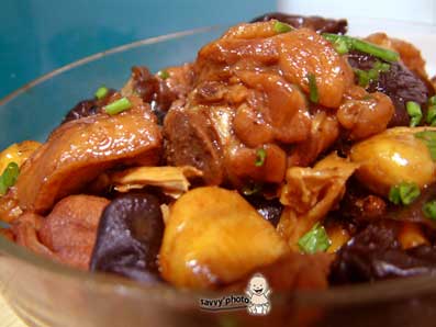 3.雞洗乾淨後,剁成3cm大小的塊。炒鍋燒熱,用素油滑鍋,再加入豬油25g,在武火上燒至六成熟,投進雞塊,煸至皮成黃色,加入料酒、姜絲、白糖,醬油,燒至黃色,放入白湯、紅棗、核桃仁燒沸,移至文火,蓋上蓋,燜燒一小時左右,倒入栗子,再燜15分鐘。