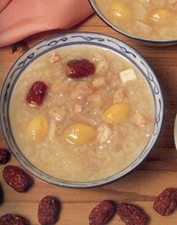 (11)紅棗糯米粥:山藥、苡仁、荸薺、大棗、糯米同煮,放入適量白糖,有健脾胃、益氣血、利濕止瀉、生津止渴之功效,適用於病後體弱及貧血、營養不良、食慾不振、慢性腸炎等患者食用。