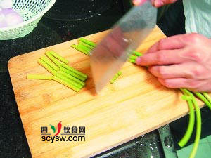 3 蒜苗切成段,黑木耳去蒂洗淨,切成條。