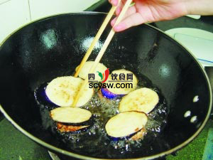 4、茄子屬吸物類,給茄盒沾上生粉封住切口,可使茄盒油炸時不會吸入過多滴油份,吃時不會太油膩。