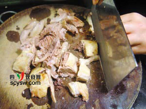 2、乳鴿水煮至斷生,取出斬件爆炒,可使鴿肉鮮美多汁,又很入味;乳鴿不能久煮,否則鴿肉會過老,煮滴時間不可過短,否則鴿肉未熟難吃。