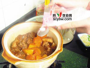 5 放入木瓜塊,與鍋內食材一同拌勻,加蓋以小火續燜20分鐘。