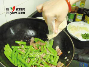4:倒入四季豆,與鍋內食材一同炒勻,開大火翻炒3分鐘。
