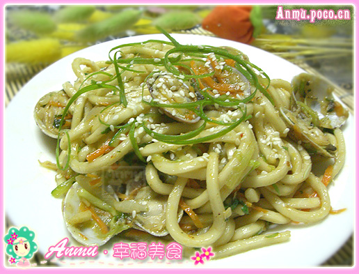 材料:炒麵2兩、花蛤10只、小黃瓜半支、胡蘿蔔半支、洋蔥半個